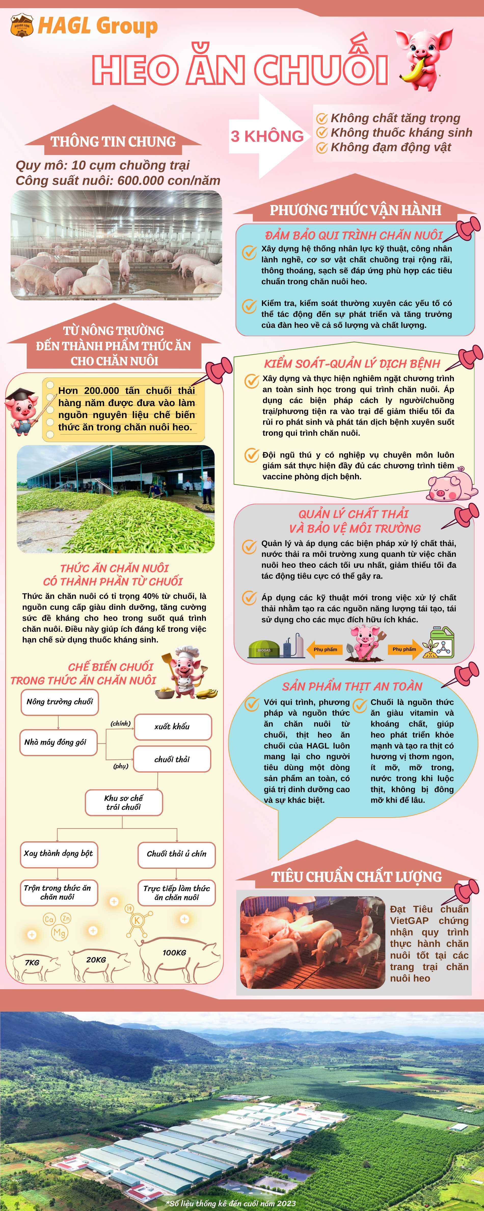 Heo ở HAGL được nuôi theo quy trình khép kín với thức ăn chủ lực là trái chuối trồng xuất khẩu của HAGL với tiêu chuẩn “ba không”: không thuốc kháng sinh, không sử dụng chất cấm, không đạm động vật. Thức ăn chăn nuôi heo sử dụng các loại thảo mộc thiên nhiên thay thế kháng sinh, giúp giữ ấm cơ thể và đường tiêu hóa khỏe mạnh, kích thích heo ăn ngon, hấp thu dinh dưỡng tốt để tăng đề kháng tự nhiên, hạn chế đau ốm. Sử dụng đạm thực vật thay thế là đậu nành, bắp, bổ sung vi lượng nhập khẩu. Để bảo vệ sức khỏe người tiêu dùng, thức ăn chăn nuôi heo HAGL không sử dụng chất cấm mà nguyên liệu hoàn toàn từ thực vật an toàn.