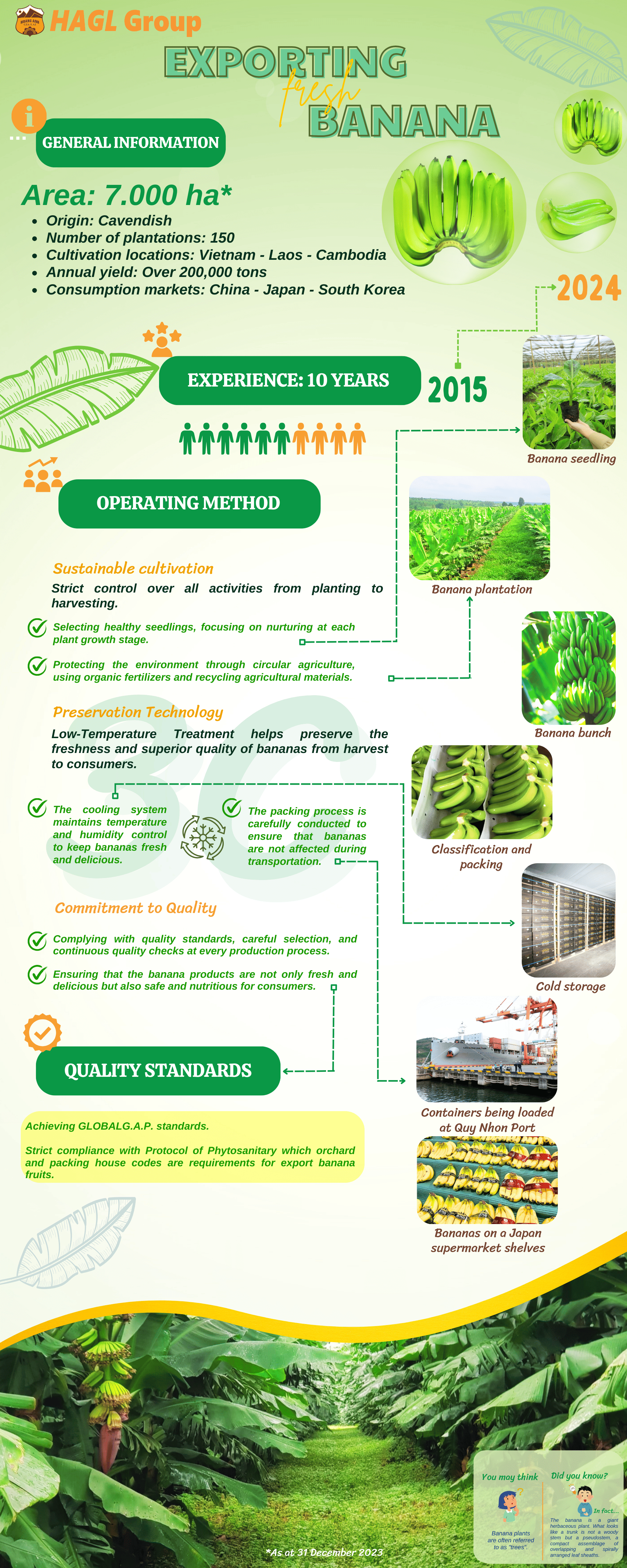 Until the end of 2023, 7,000 hectares of bananas have been planted across various regions with diverse soils and climates, HAGL Group's banana output remains consistently stable, ensuring readiness to meet the demands of large orders.