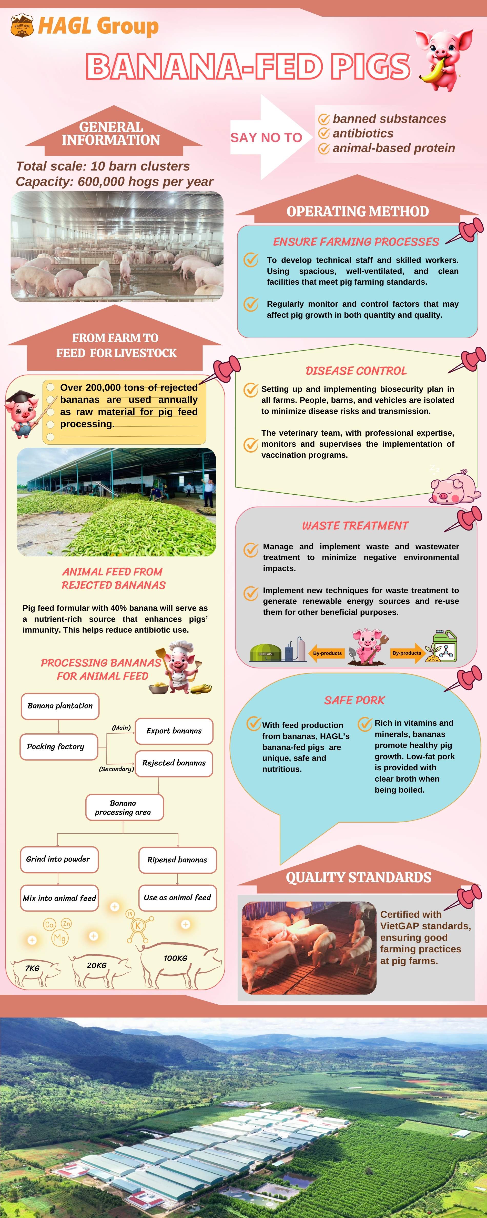 HAGL pigs are raised by a closed process with the main food being bananas grown for export by HAGL with the "three nos" standard: no antibiotics, no banned substances, and no animal-based protein. Pig feed uses natural herbs in place of antibiotics, helping to keep the body warm and the digestive system healthy, whetting the pig appetite, fully absorbing nutrients to increase natural disease resistance, and disease prevention. Plant protein is used as replacement like soybeans, corn supplemented with imported micronutrients. To protect consumer health, HAGL pig feed is free from weight gain substances preferring instead safe plant-based materials.