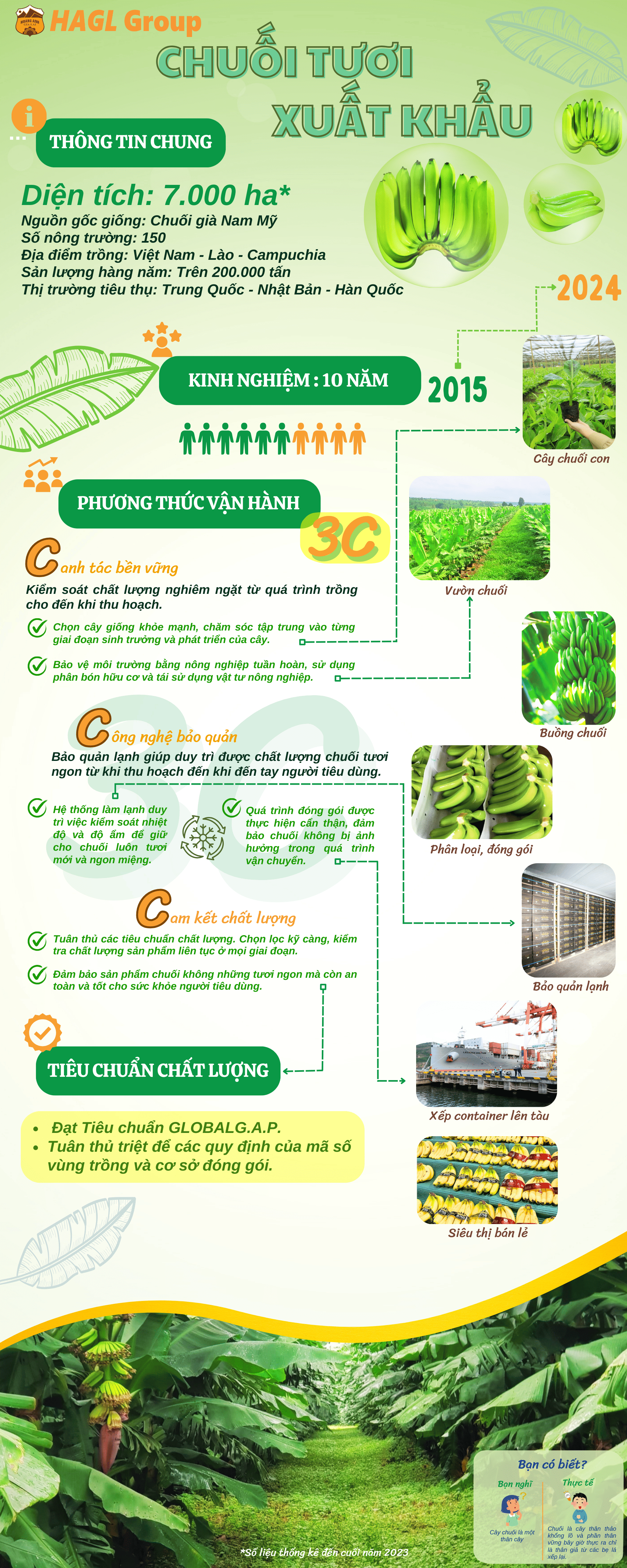 Tính đến cuối năm 2023, với diện tích chuối hơn 7.000 hecta được trồng trên nhiều khu vực thổ nhưỡng và khí hậu khác nhau, sản lượng chuối của tập đoàn HAGL luôn ổn định, sẵn sàng đáp ứng nhu cầu những đơn hàng lớn.